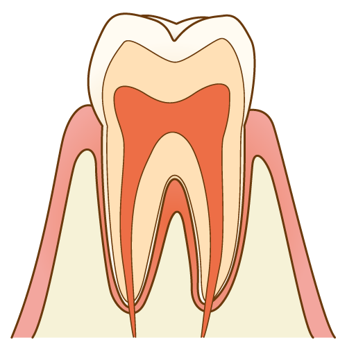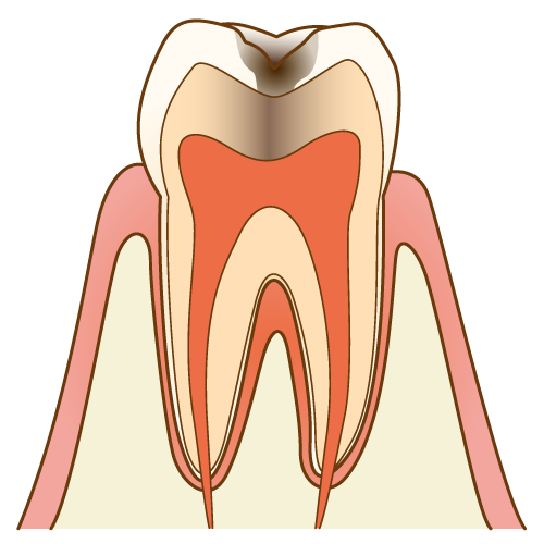 - エナメル質の内側の象牙質という部分まで、むし歯が到達した状態です。冷たいものがしみたり傷んだりします。