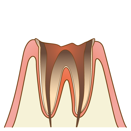 - むし歯が神経に達した状態です。見た目の変化は小さくても、炎症があるため激しい痛みを伴う場合があります。