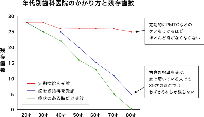 悪い所が無くても、定期的にお口のクリーニングを受けると、そうでない場合に比べて歯が残る数が大変違ってきます。