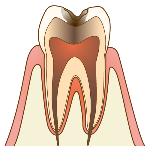 - エナメル質の内側の象牙質という部分まで、むし歯が到達した状態です。冷たいものがしみたり傷んだりします。