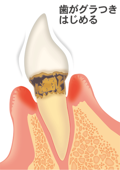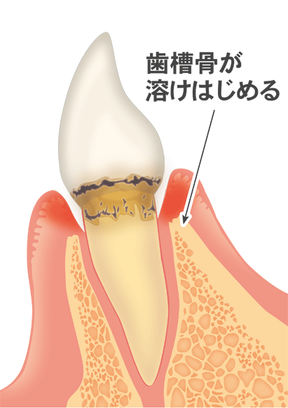 進行すると軽度歯周炎という状態になり、歯根膜や歯槽骨の破壊が始まります。