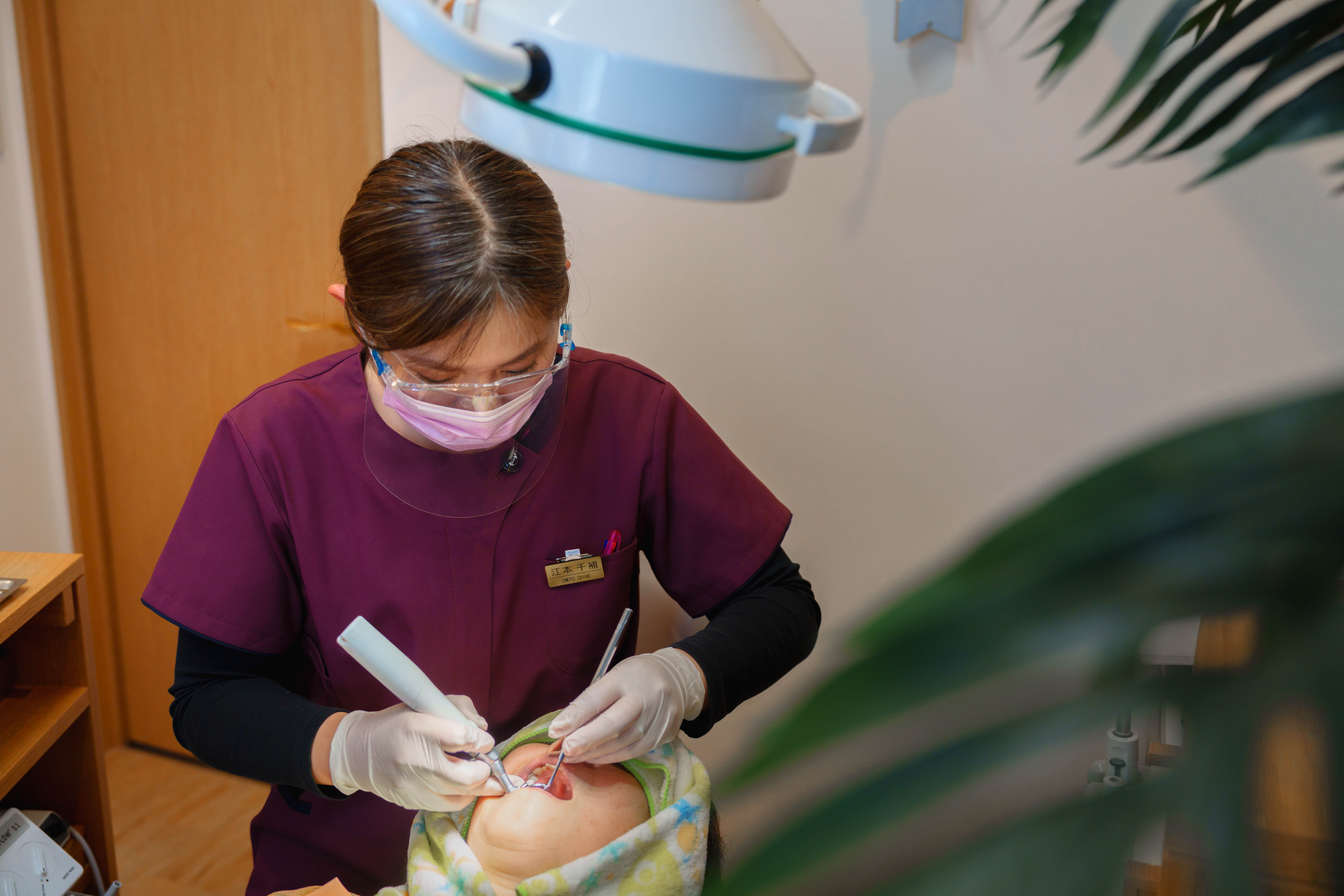 当院では、定期検診(3ヶ月ごと)で歯の汚れを落とした後、歯に直接フッ素を塗り、むし歯に強い歯へと育ていきます。